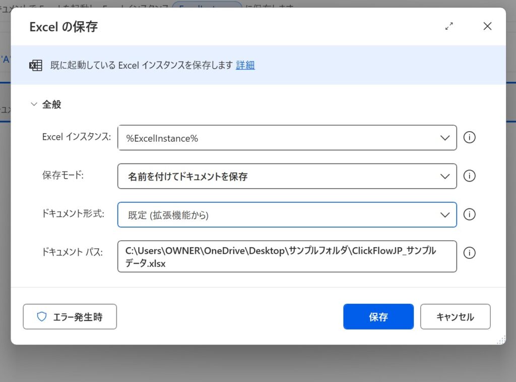 → 保存先のフルパスを入力します。例:C:\Users\OWNER\OneDrive\Desktop\サンプルフォルダ\ClickFlowJP_サンプルデータ.xlsx ※事前にフォルダが存在している必要があります。ドキュメントパスを簡単に取得する方法があります。これについては、別の記事でご紹介します。